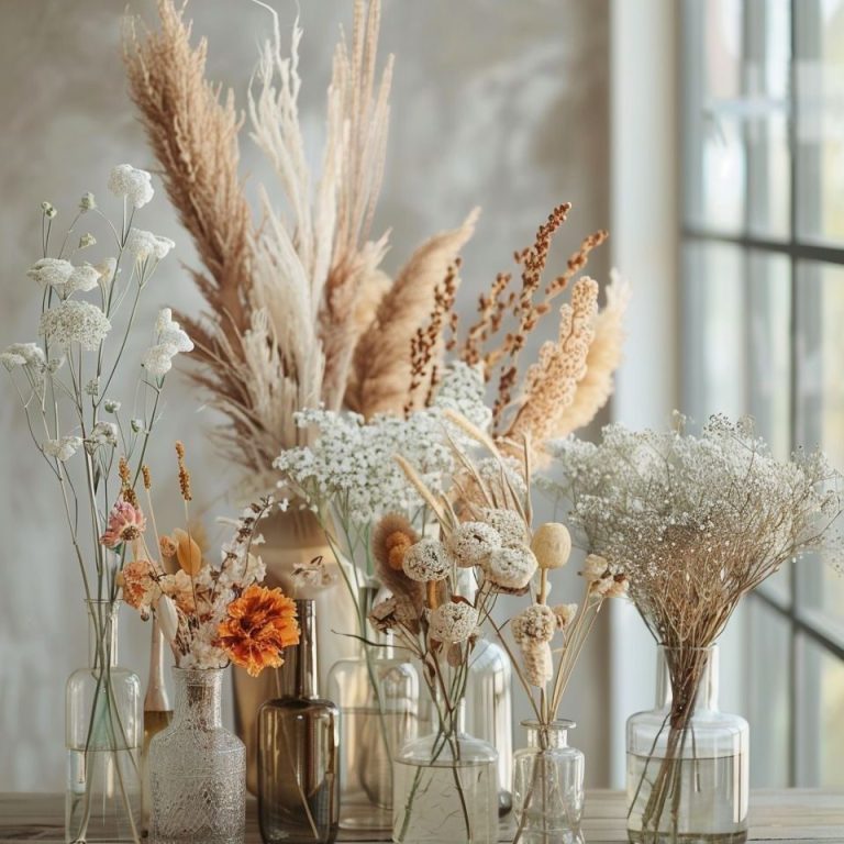 Wir verwenden Trockenblumen, Holz und viele andere natürliche Elemente.